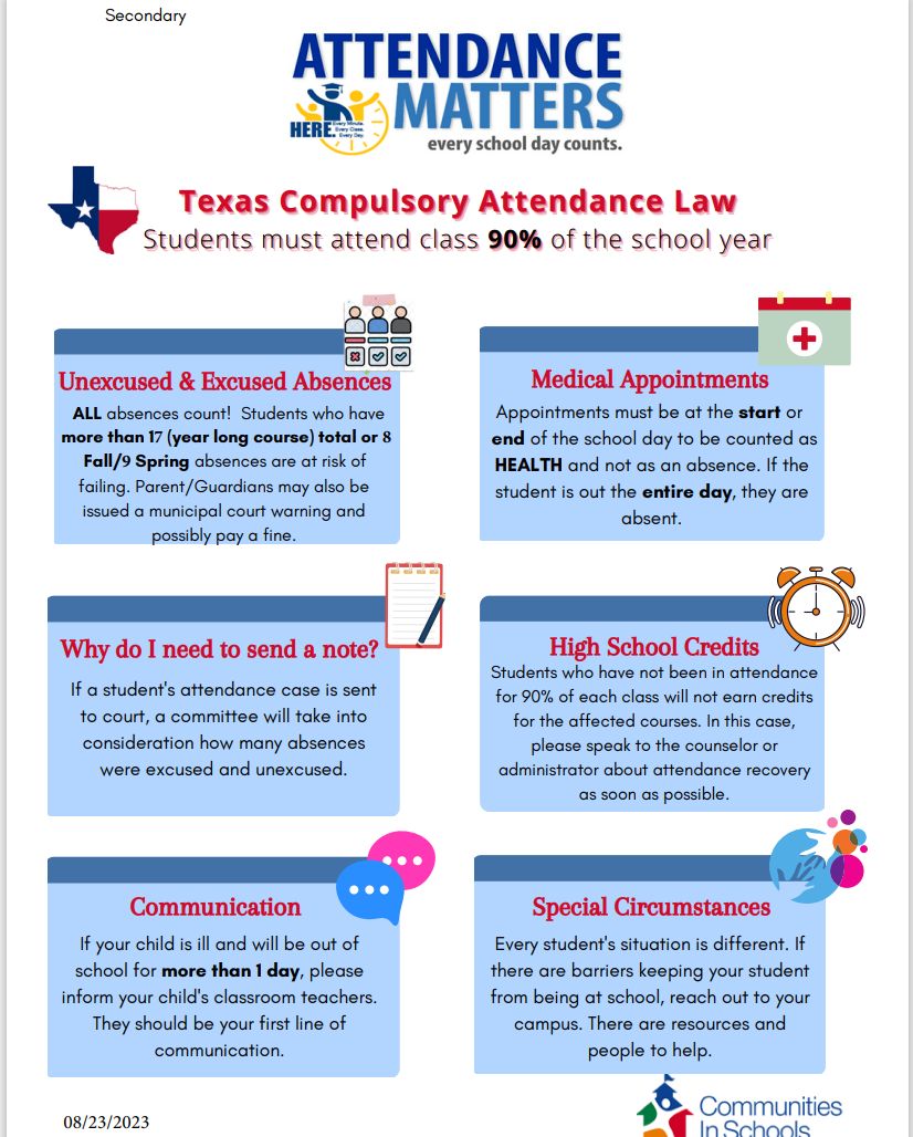 Please be advised that if a student is absent without an excuse for 3 or more days or parts of days in a four-week period, or 10 or more days within a six-month period, the student’s parents and/or the student are subject to prosecution under the Texas Education Code after a Truancy Warning Notice is issued (TEC 25.093 & .095).