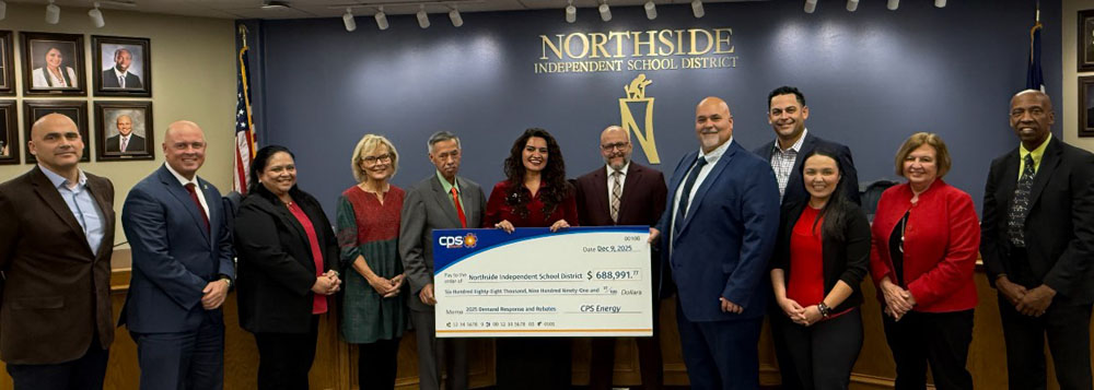 Representatives from CPS Energy attended the Dec. 9 Board meeting to present NISD with a rebate check totaling $688,992, recognizing the district’s participation in the Demand Response Program and additional energy rebates collected.