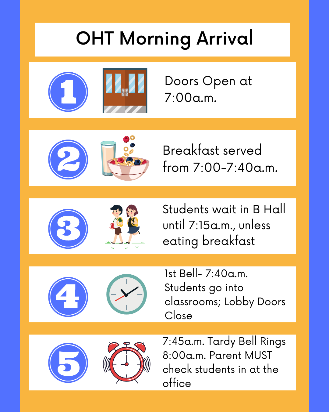 - 8:00a.m. Tardy students MUST be checked into the office by a parent or guardian if dropped off after 8:00a.m.