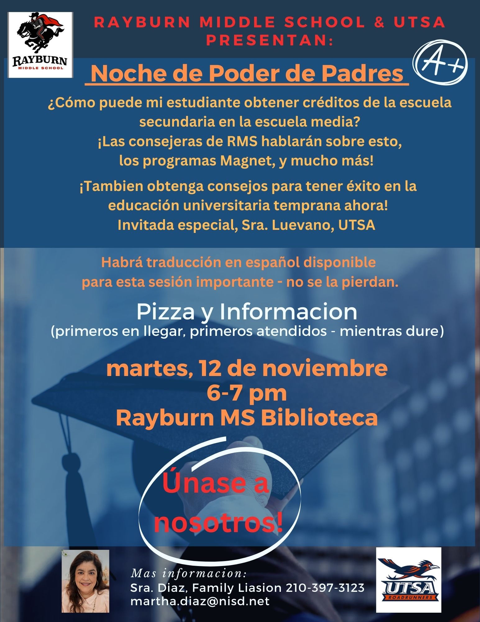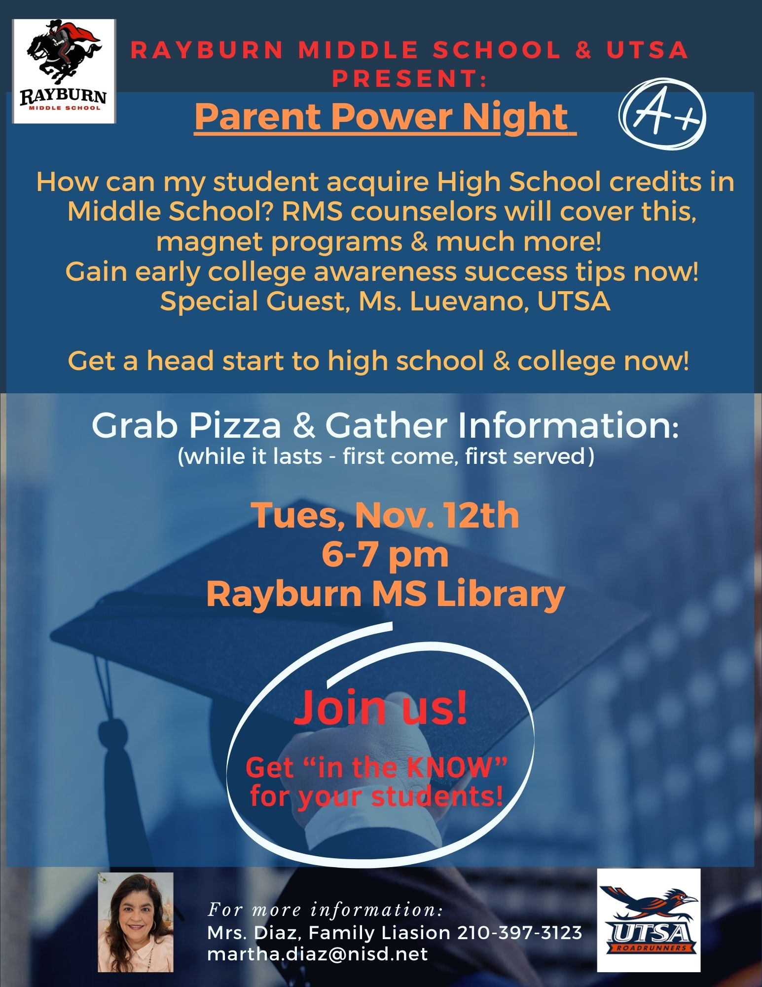 Join us Tues, 11/12 @ 6 pm in the library. UTSA & our counselors will be presenting on everything you need to know about classes, magnet programs, high school credit and getting ready for college now! Don't cook tonight! Enjoy pizza - first come, first served! Cool college giveaways too! We can't wait to see you!