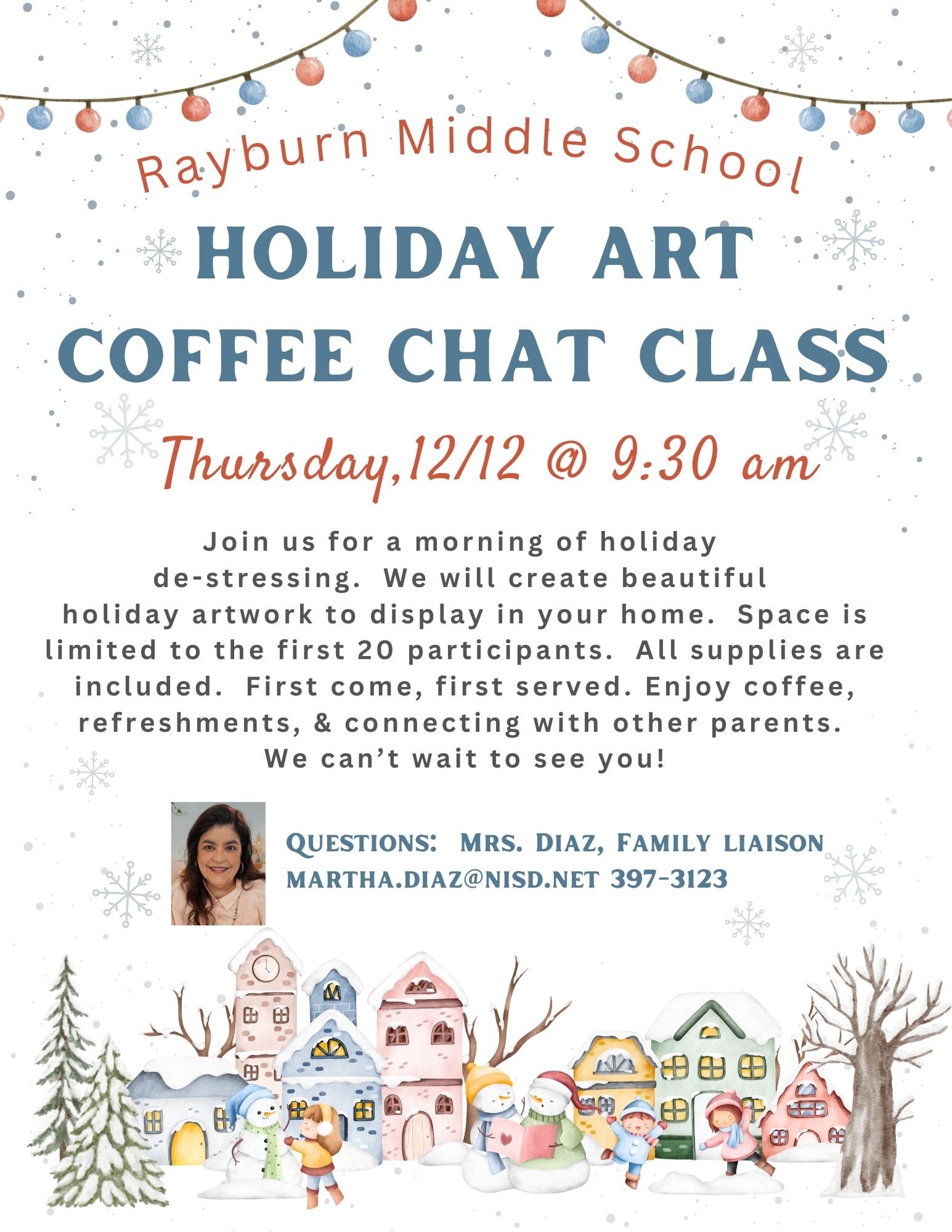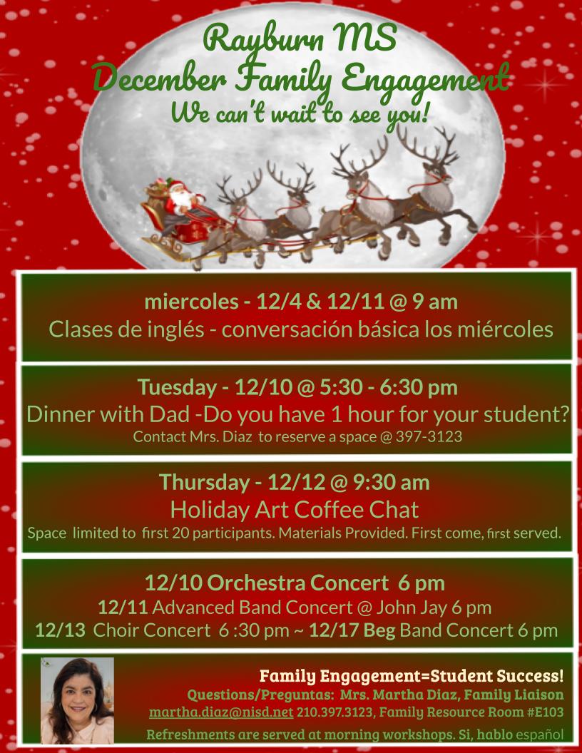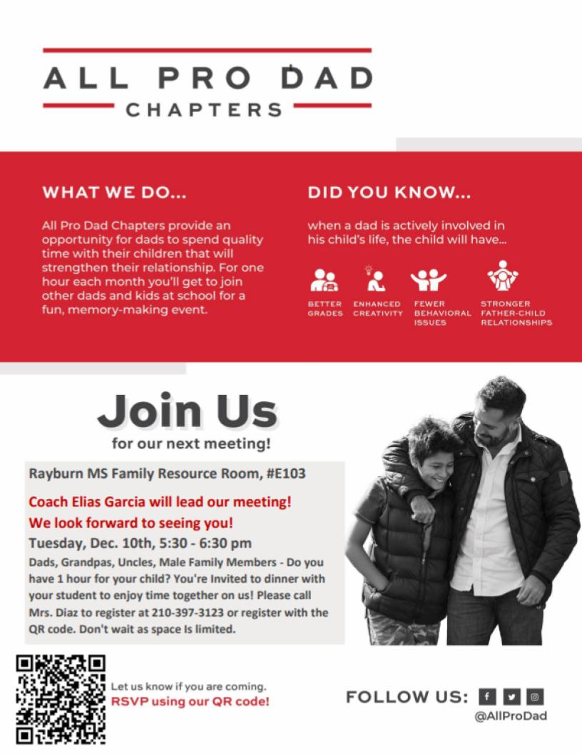 Join us in December for Dinner with All Pro Dads and a Holiday Art Coffee Chat. Space is limited at our Dad's Dinner. Please contact Mrs. Diaz to save a spot at 210-397-3123 or scan the QR code. Space is also limited for our Holiday Art Coffee Chat. First come, first served. No reserved seating. All materials and refreshments provided. Don't miss our wonderful holiday concerts and performances. Happy Holidays! We can't wait to see you!