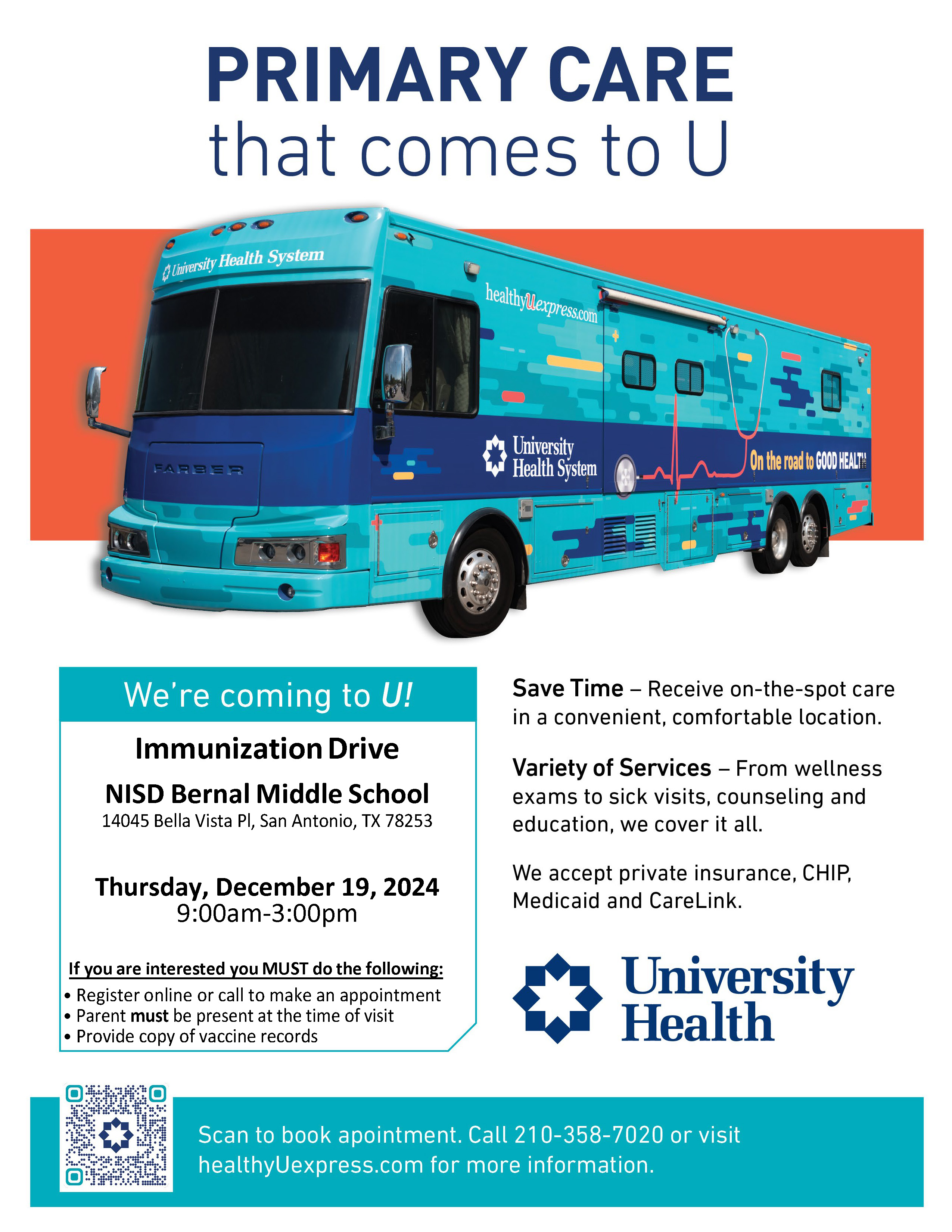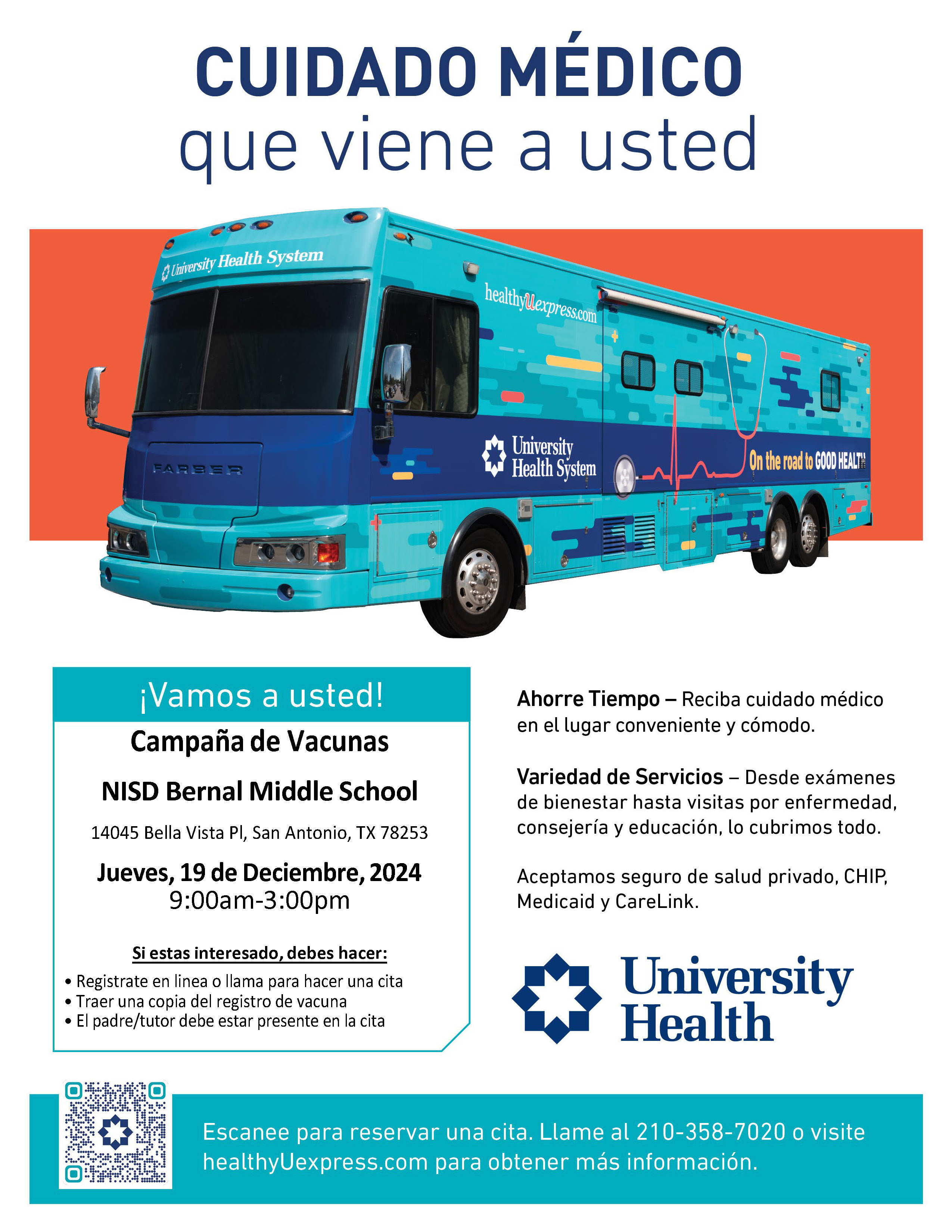 Bernal MS along with UHS will be hosting a vaccine clinic on December 19th 9am-3pm