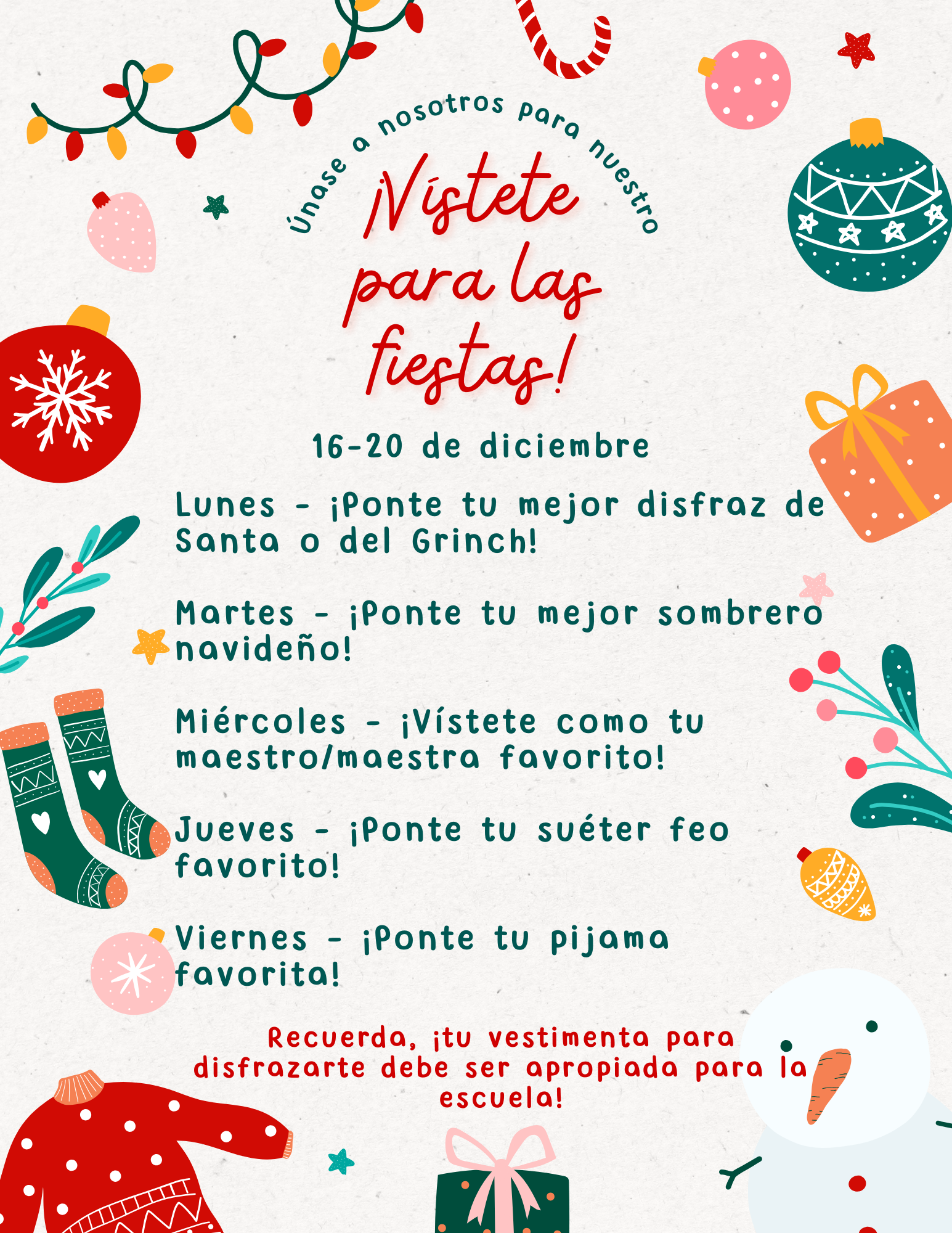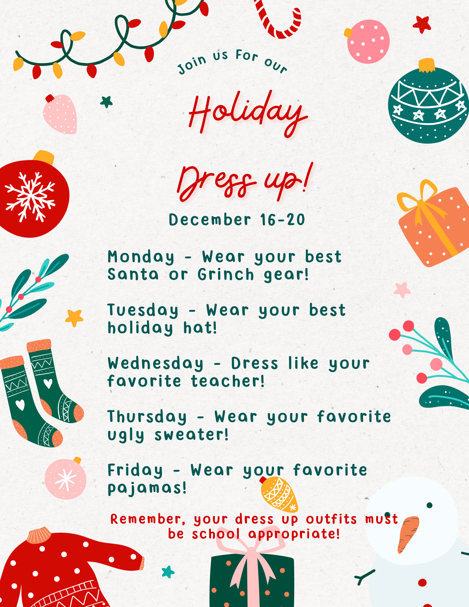 You'll find the Holiday Dress Up calendar below for students to get into the spirit this coming week. Remember that all clothing must be school-appropriate and follow the NISD dress code outlined in the student handbook.