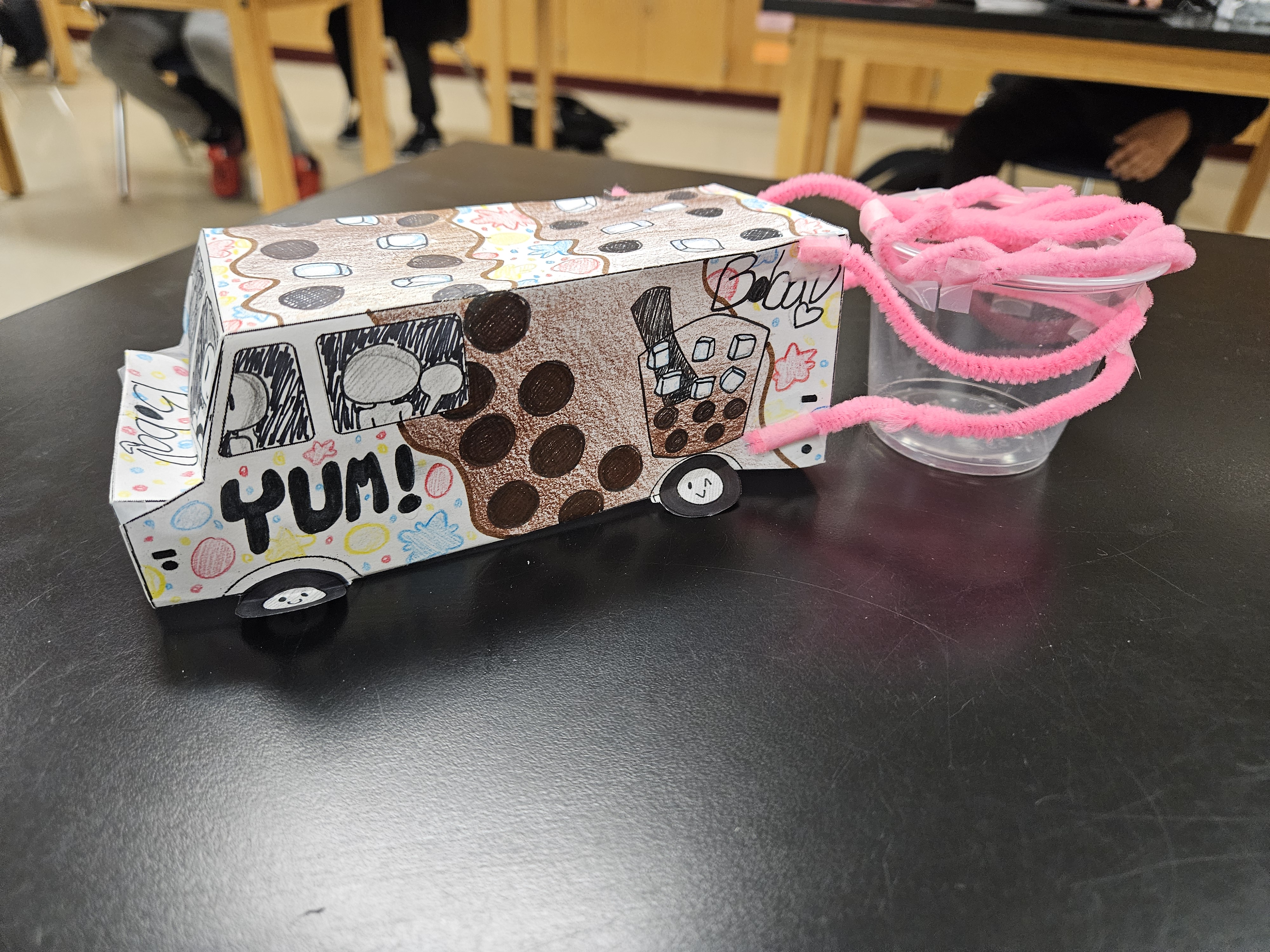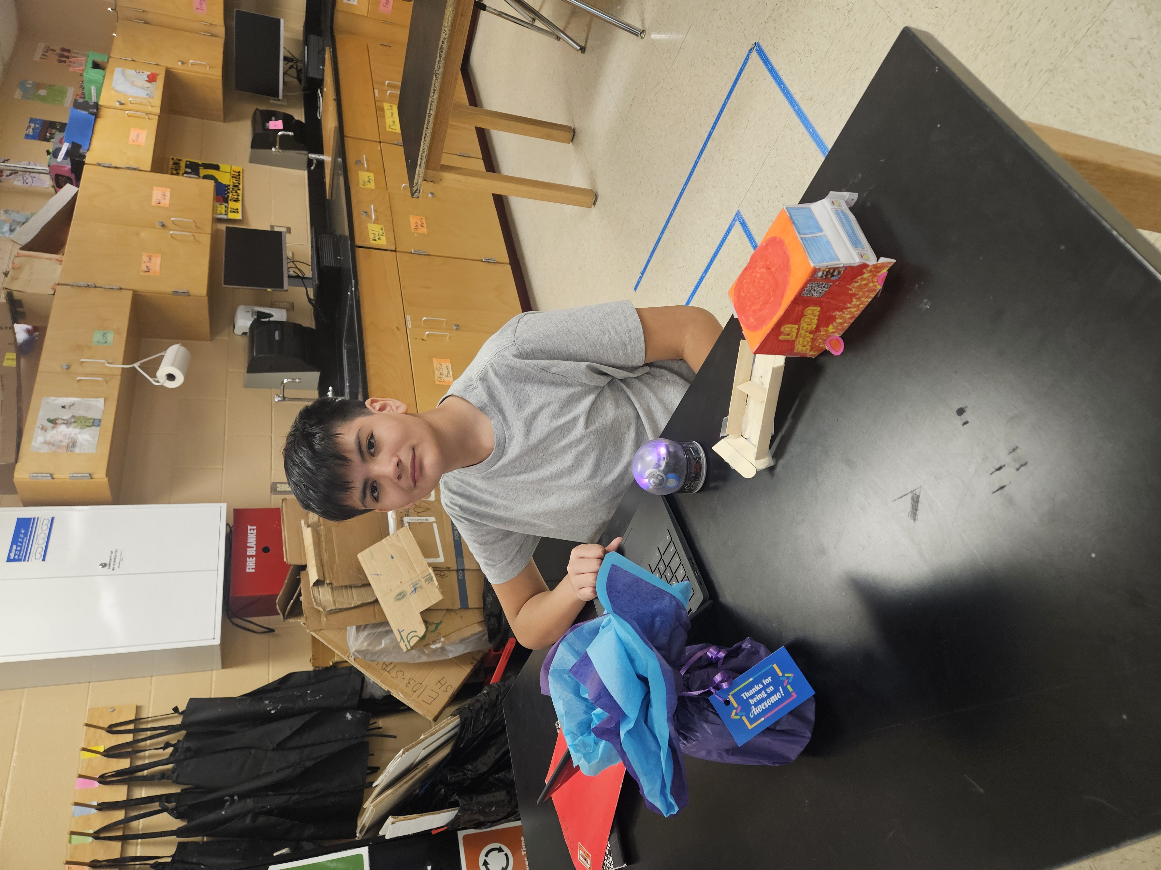 Our 7th grade GT students participated in the Sphero Dash Challenge. They were tasked with building a distribution vehicle using only the items available for purchase on a $30 budget. They had 2 minutes to transport as many packages (marbles) as possible using their Sphero coding program. Students received 1 point for each marble transported to the landing zone and a ½ point for each dollar they did not spend. Our winner from 3rd period was Noah C. with 46 points, and our winner from 4th period was Brad B. with 36.5 points. Olivia F. won the distribution vehicle decorating contest! Way to go 7th grade! Proud of you!