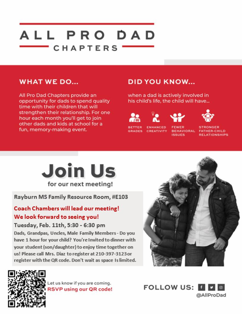 Enjoy dinner on us with your child! This dinner is for your student and their Dad or any adult male family member. Space is limited so register soon as registration will close. You may register with the QR code or contact Mrs. Diaz directly at 210-397-3123 or at [email protected]