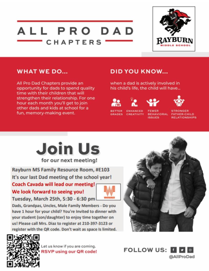 Join us! Register to attend the last Dinner with Dad of the school year with your son and/or daughter. Do you have one hour to spend with your child? Enjoy Whataburger on us and spending time together. Space is limited and registration is required to attend. Use the QR code or contact Mrs. Diaz, Family Liaison today at 210-397-3123 to reserve your spot!