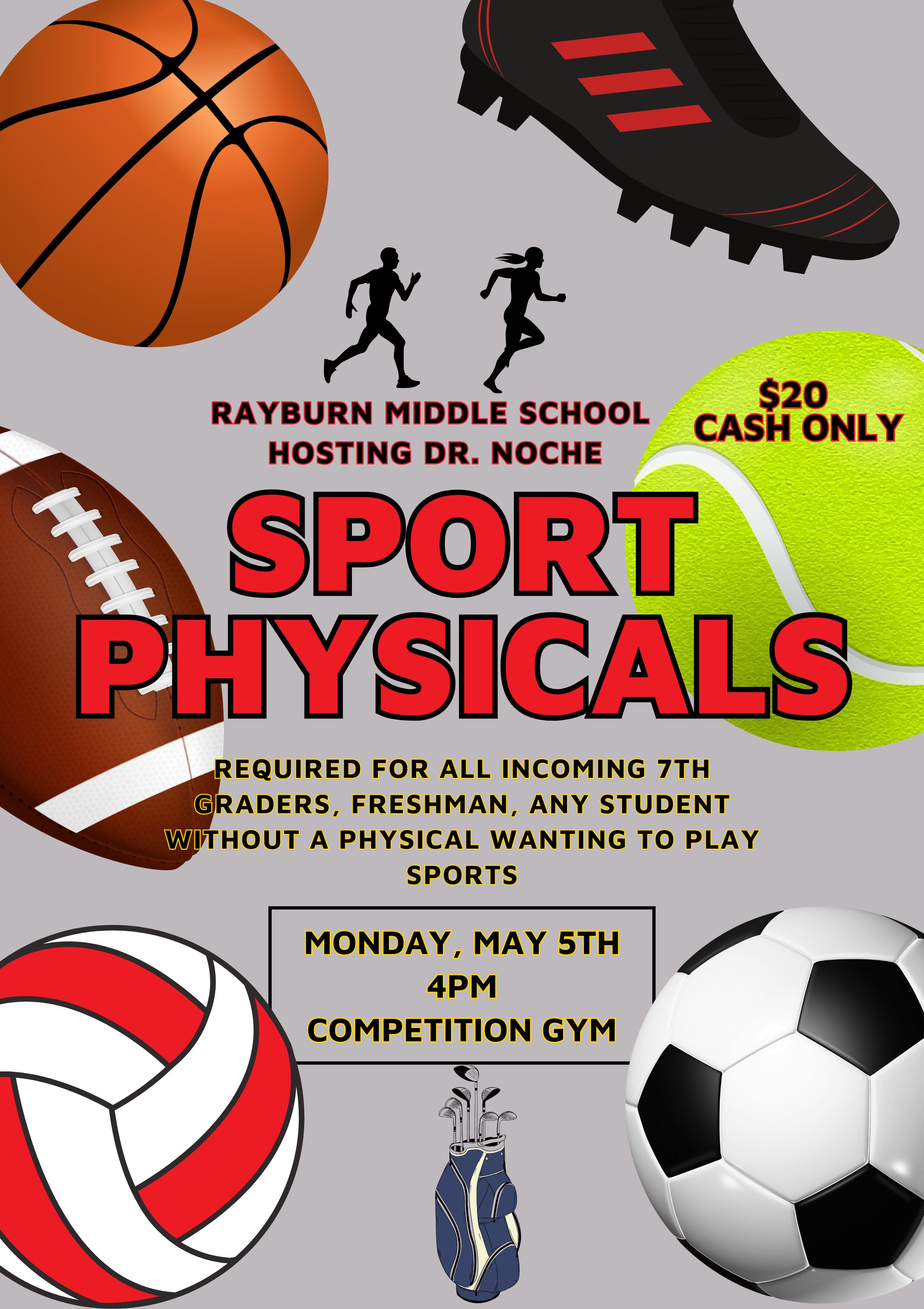 Rayburn Middle School will be hosting Dr. Noche for Sport Physicals on Monday, May 5th at 4 PM in the Competition Gym.